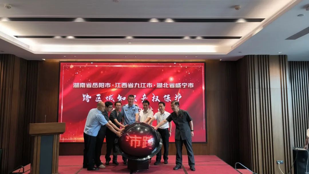 9月16日,湖北省咸宁市、湖南省岳阳市、江西省九江市跨区域知识产权保护工作交流暨合作签约活动在湖南岳阳举行,三市市场监督管理局、中级人民法院有关领导参加活动,市局党组成员、副局长刘杰军代表咸宁市市场监督管理局签约。