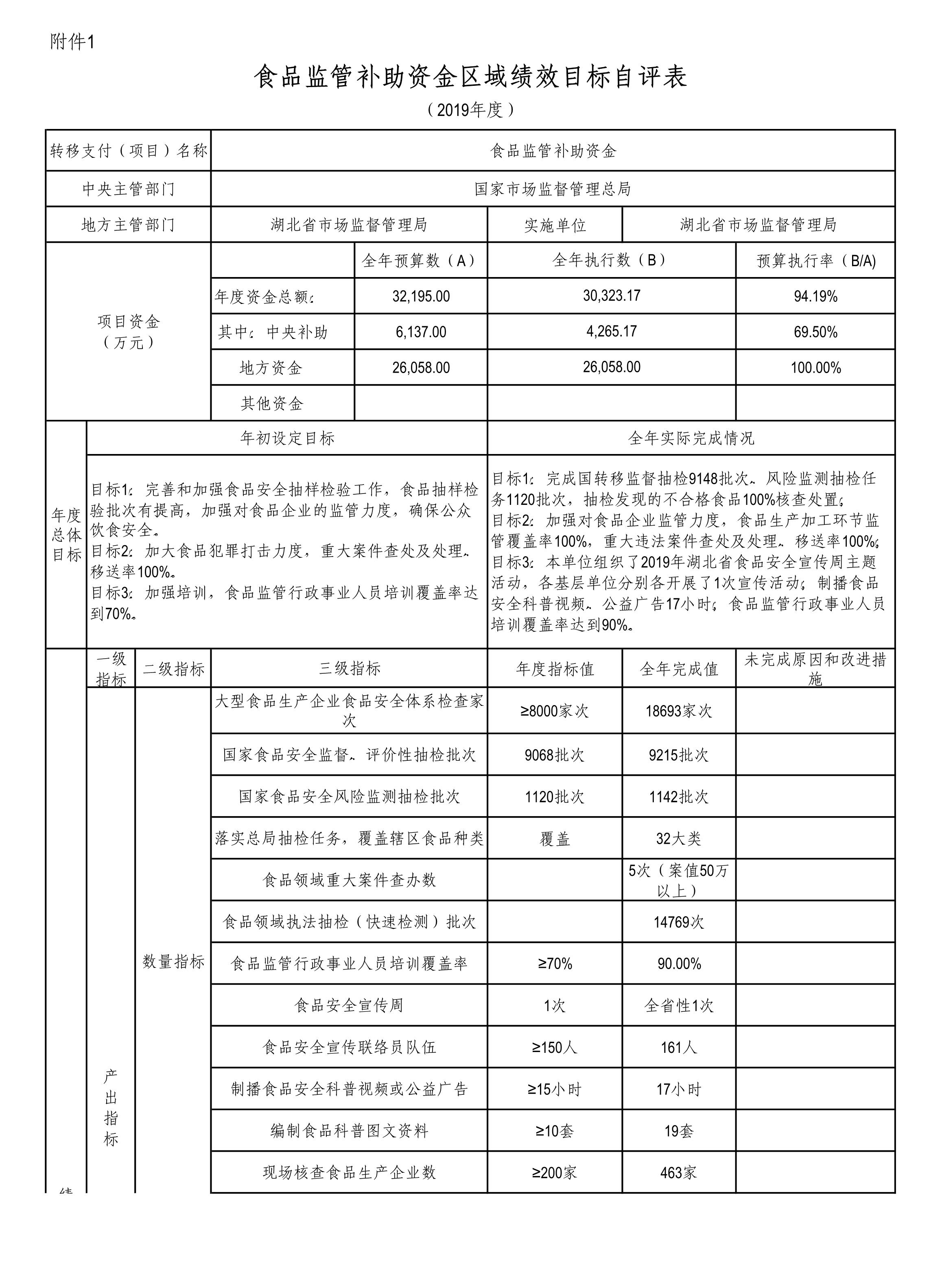 湖北省市场监督管理局专项转移支付2019年度绩效自评报告