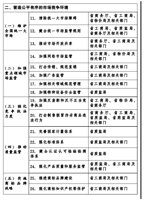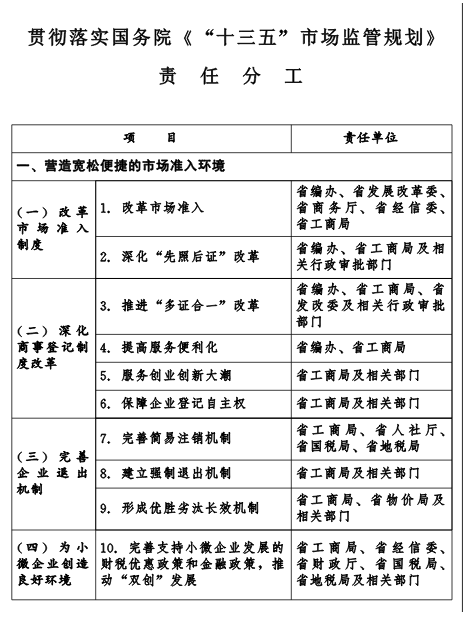 为认真贯彻《国务院关于印发“十三五”市场监管规划的通知》(国发〔2017〕6号,以下简称《规划》)精神,进一步推进市场监管改革与创新,加快形成有利于创业创新、诚信守法、公平竞争的市场环境,经省政府同意,现就贯彻落实《规划》的具体事项及有关责任分工通知如下: