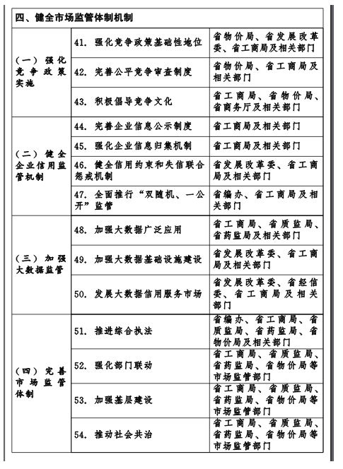 各地、各有关部门要牢固树立依法监管、简约监管、审慎监管、综合监管、智慧监管、协同监管等现代市场监管理念,不断完善市场监管体制机制,创新市场监管方式方法,着力构建统一规范、权责明确、公正高效、法治保障、执法有力的市场监管体系。要强化竞争政策基础性地位,完善公平竞争审查制度,积极倡导竞争文化,建立健全竞争政策实施机制,开展行政领域反垄断执法,防止并及时纠正排除、限制竞争的政策措施,逐步清理废除妨碍全省统一市场、公平竞争的规定和做法。完善企业信息公示制度,强化企业信息归集,健全信用约束和失信联合惩戒机制,全面推行“双随机、一公开”监管,不断完善企业信用监管机制。充分运用大数据等新一代信息技术,加强大数据应用和大数据基础设施建设,发展大数据信用服务市场,建立大数据监管机制,增强市场监管的智慧化、精准化水平。按照中央统一部署,推进市场监管综合执法改革,强化部门监管联动,加强执法队伍和基层建设,推动社会共治,建立协调配合、运转高效的市场监管体制机制。完善市场监管规章制度体系,规范执法行为,强化执法监督,健全完善行政执法与刑事司法衔接机制,提高市场监管制度化、规范化、法治化水平。