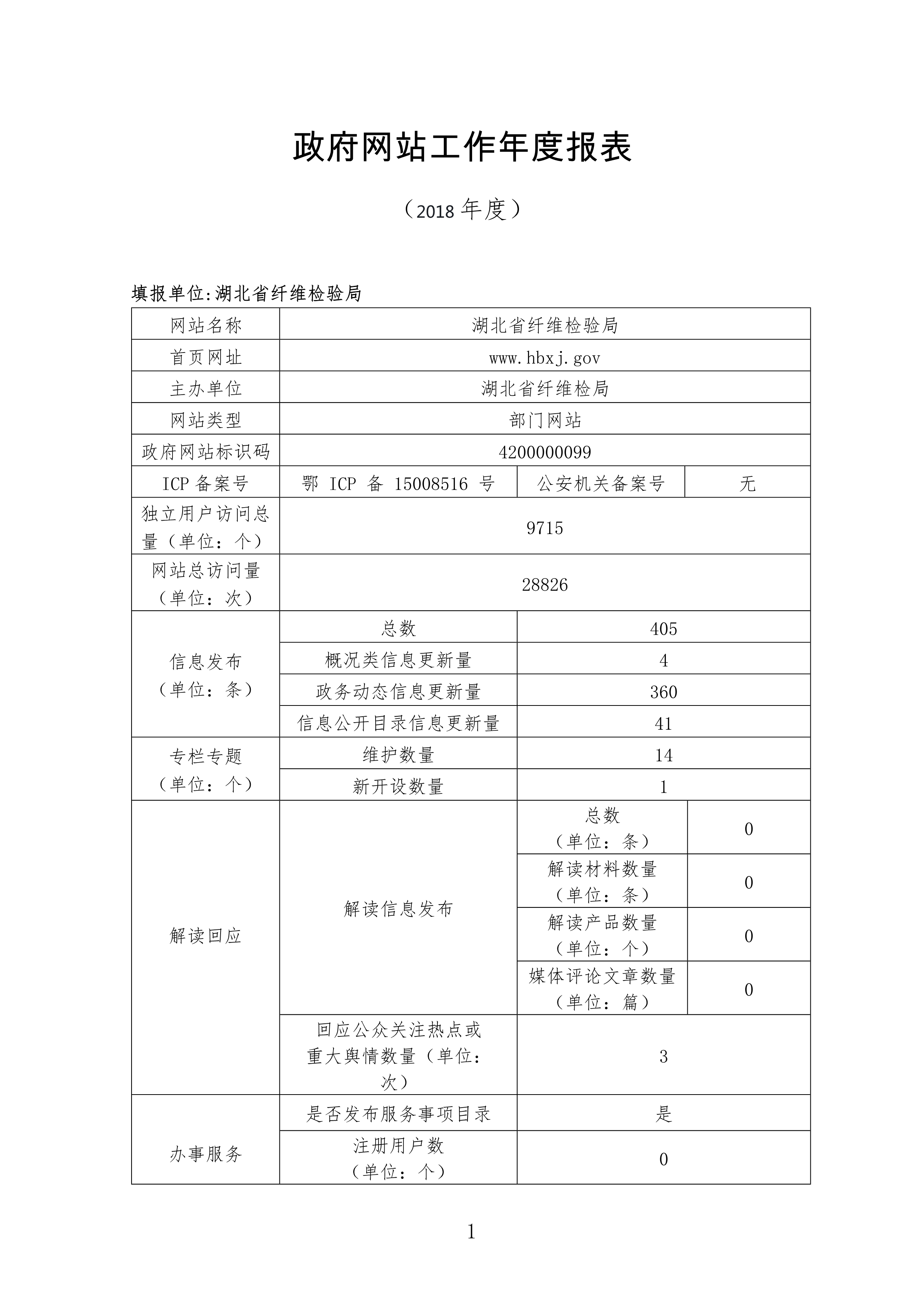 政府网站工作年度报表(湖北省纤维检验局网站,2018年度)