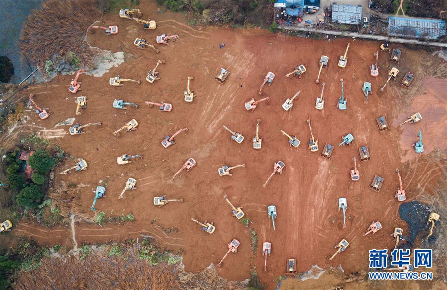 大型机械在武汉火神山医院建设工地施工(1月24日摄,无人机照片)。 新华社记者 肖艺九 摄